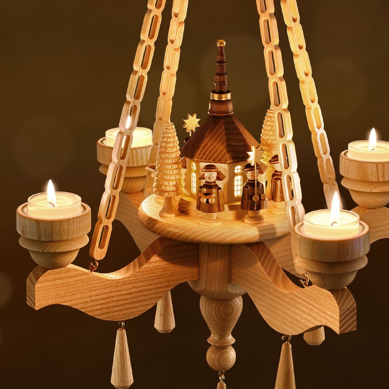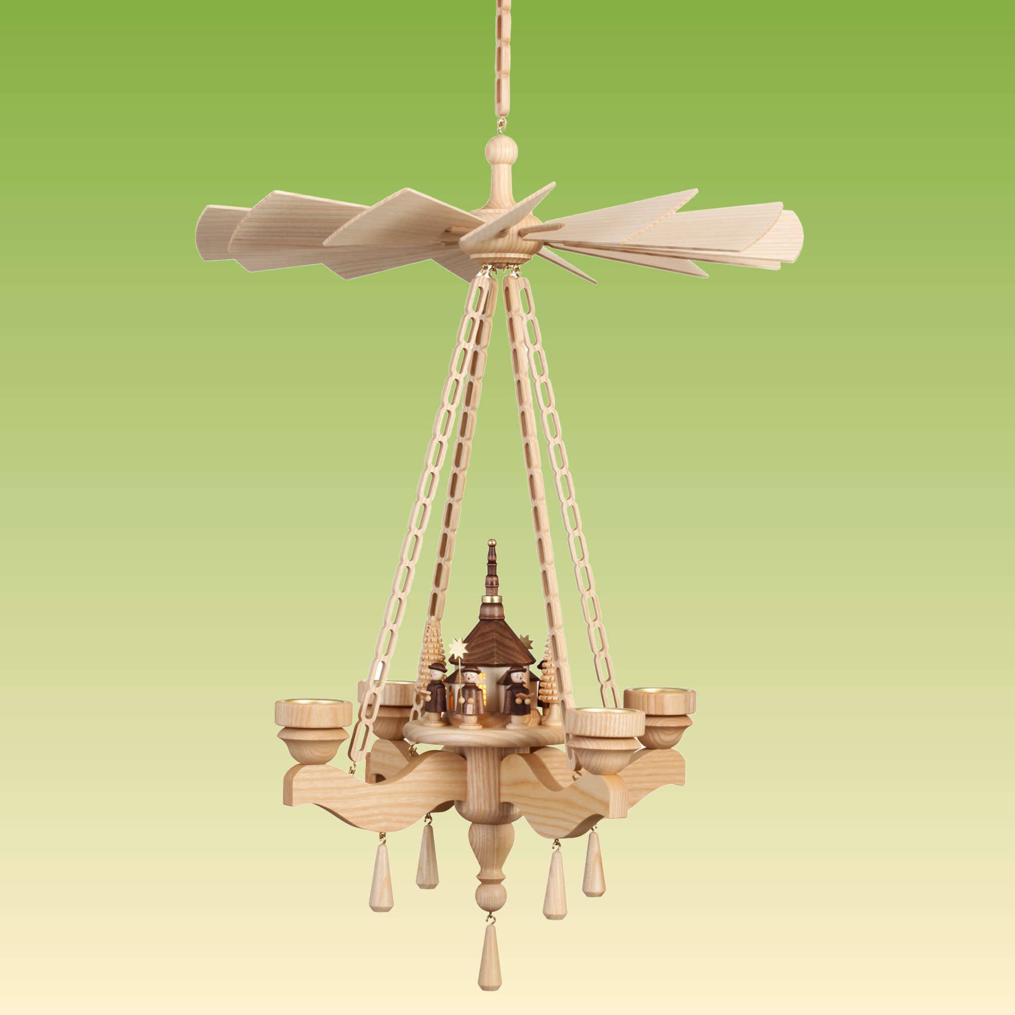 Die Pyramide ist 65 cm hoch und 42 cm breit. Sechs lasierte Kurrendesänger und handgedrechselte Ringelbäumchen umsäumen die innenbeleuchtete Seiffener Kirche auf einer auswechselbaren Motivplatte. Die Beleuchtung wird mit einer auswechselbaren AAA-Batterie betrieben, die eine Leuchtdauer von ca. 100 Stunden hat. Der Schalter befindet sich an der Motivplatte. Die Deckenpyramide wird komplett aus massivem, hellem Eschenholz in Handarbeit in unserer Werkstatt im Erzgebirge gefertigt. Ende der 90er Jahre wurde durch Holzpielzeugmachermeister Torsten Unger eine alte Tradition aus dem Erzgebirge wieder neu umgesetzt: Die Deckenpyramide. Erstaunt und verblüfft stehen immer wieder interessierte Betrachter, wie sich die Pyramide mit 4 Kerzen durch die aufsteigende Wärme an einem Deckenlager, dem sogenannten Venetel, ganz gemächlich zu drehen beginnt. Durch das dabei an die Decke projizierte Lichtspiel kommt sofort eine ganz besondere weihnachtliche Stimmung auf. Wir fertigen Deckenpyramiden in 3 verschiedenen Größen, dabei auch mit 2 Etagen. Als besonderes Gestaltungsmerkmal werden alle Deckenpyramiden von einzigartigen Holzkettenstäben getragen, die wie die Pyramiden selbst geschmacksmustergeschützt sind. Wir sind zertifizierter Hersteller Echt Erzgebirgischer Volkskunst®